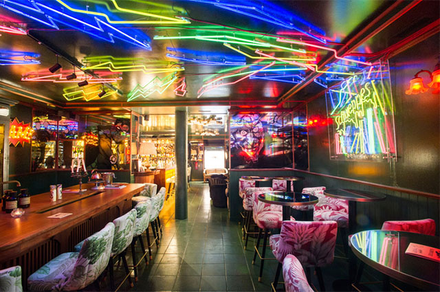 Este cóctel-bar con sillones de terciopelo, neones por un tubo, lámparas de animal print y carteles de cómics en las paredes, es uno de los más canallas del barrio de Las Letras. Tienes tres zonas para elegir según el ánimo de las tropas: su barra de madera con banquetas altas para estar al loro de todo lo que pasa, una zona de mesas bajitas si el plan más íntimo y una gran mesa de madera (la mesa del barman) en la que hacen talleres y a veces puedes encontrarte al mismísimo Diego Cabrera improvisando alguna de sus mezclas. Salmon Guru. Calle Echegaray, 21 (Metro Antón Martín). Tel: 91 000 61 85. Abierto de lunes a jueves de 17:00 a 02:00; viernes y sábado de 17:00 a 02:30. Precio: margarita a 10€. Más info en su web www.salmonguru.es o en su Facebook.
